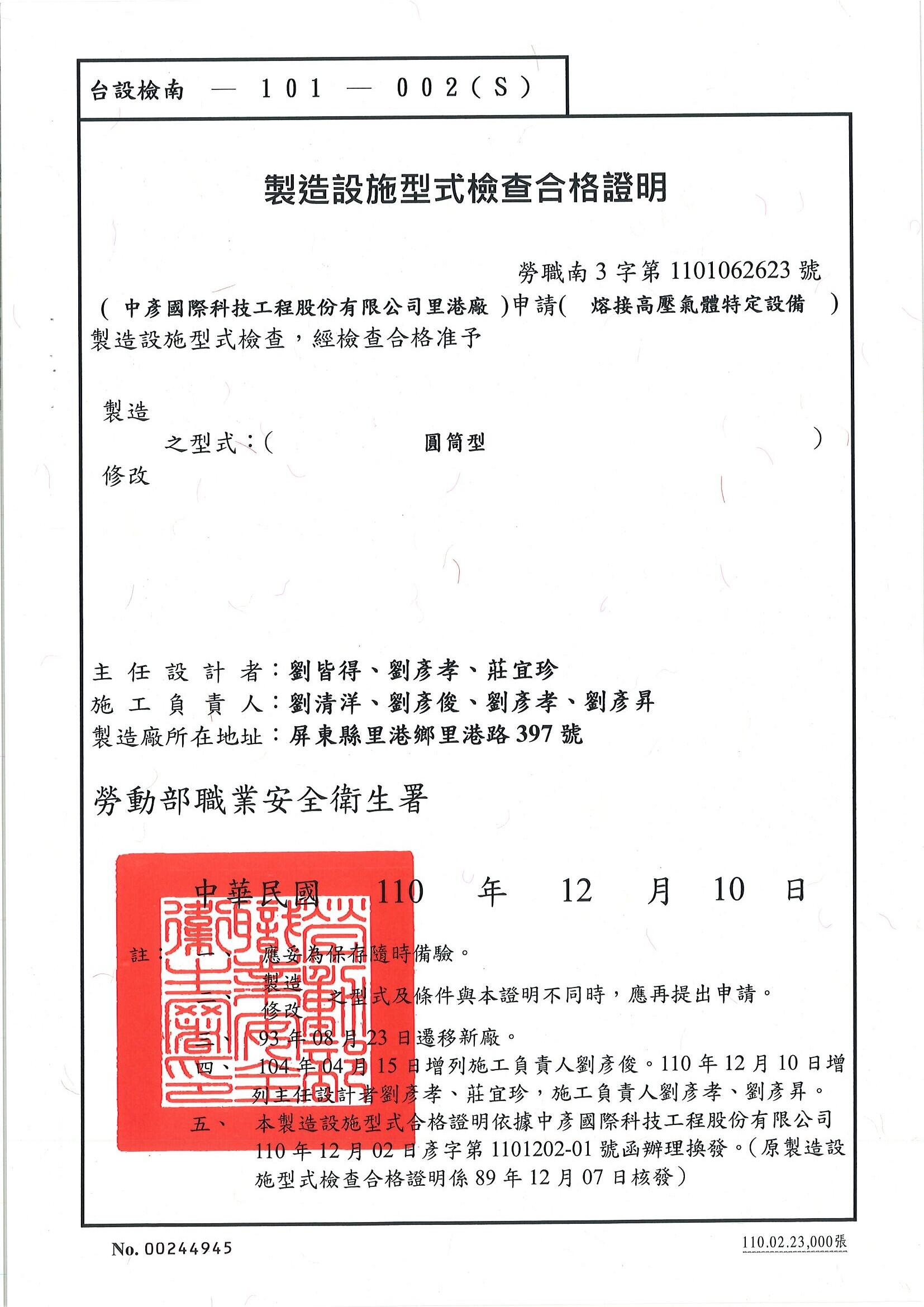 台設檢南-101-002(S) : 熔接高壓氣體特定設備(圓筒型)