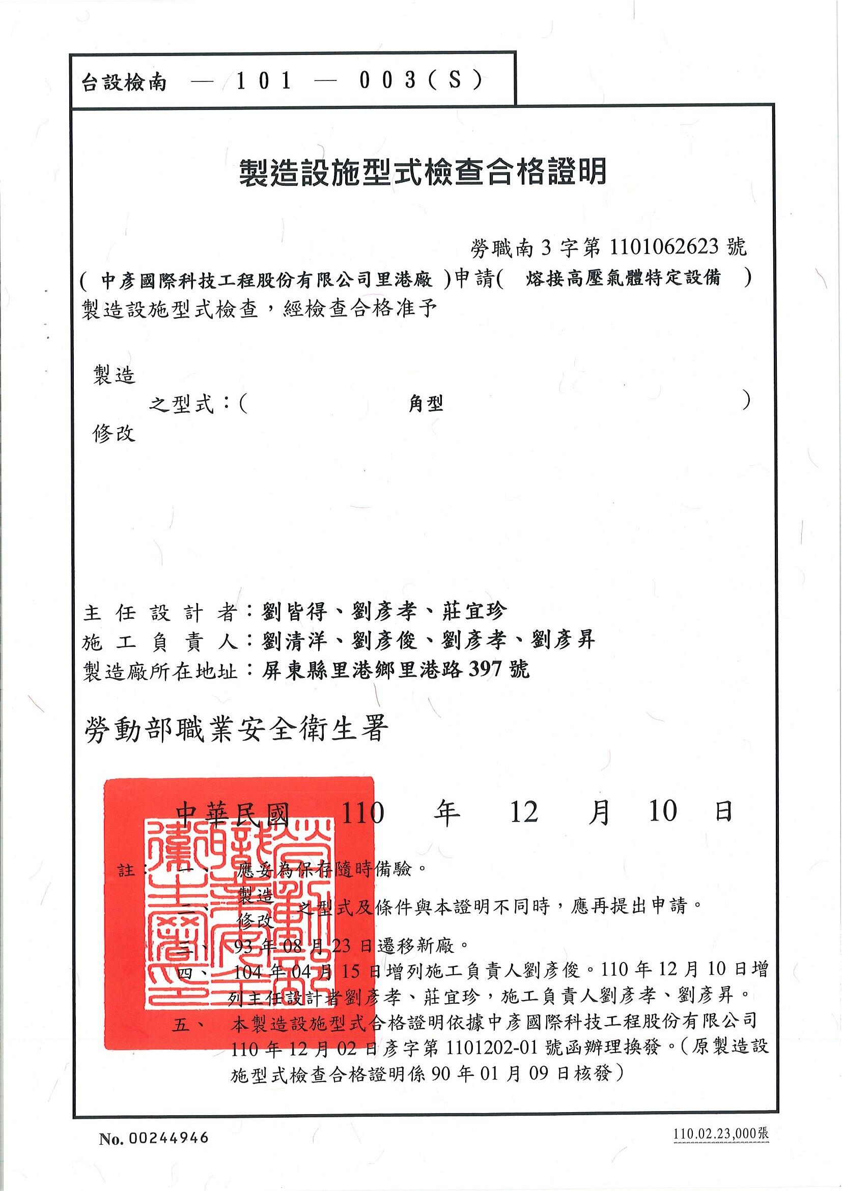 台設檢南-101-003(S) : 熔接高壓氣體特定設備(角型)