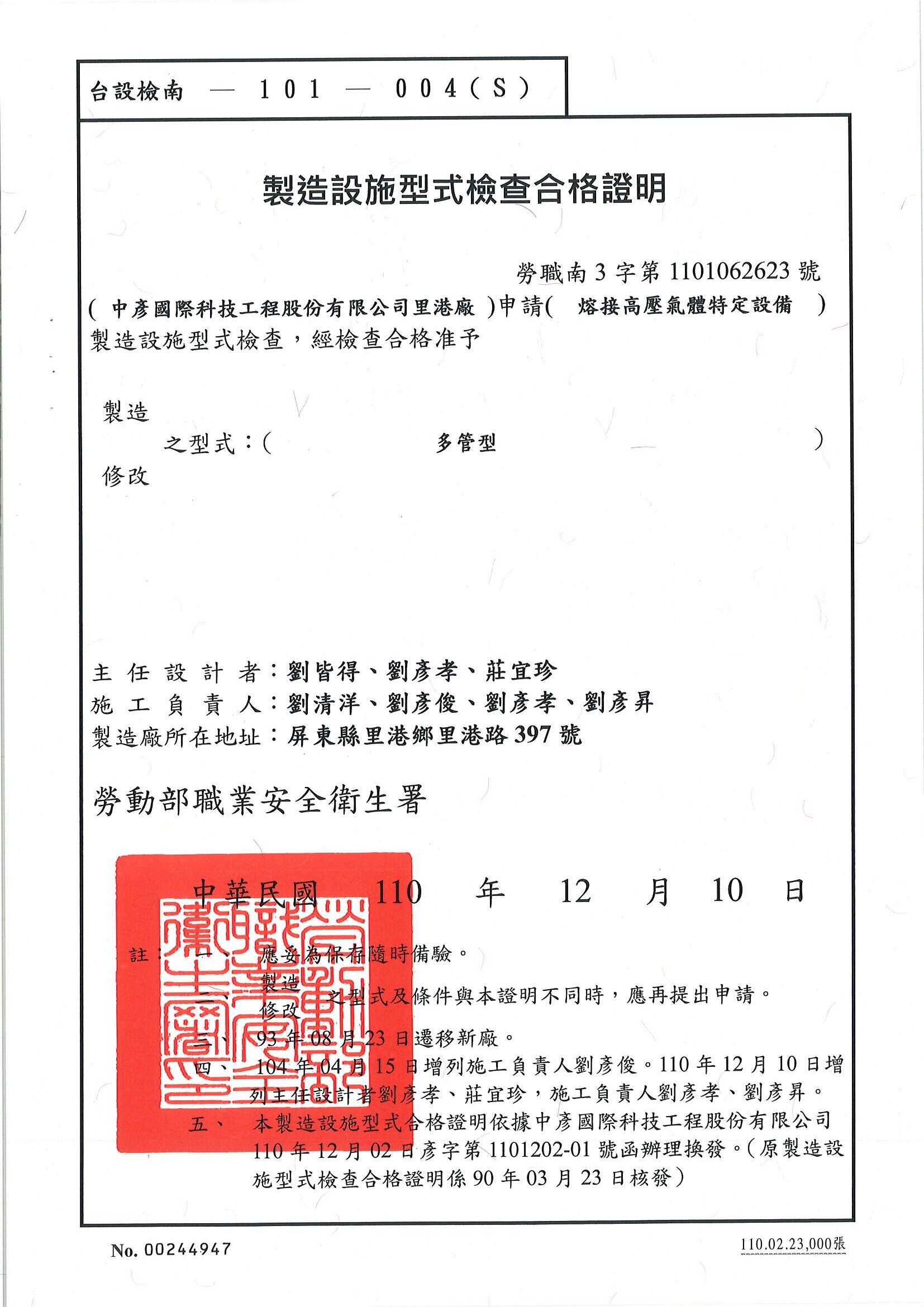 台設檢南-101-004(S) : 熔接高壓氣體特定設備(多管型)