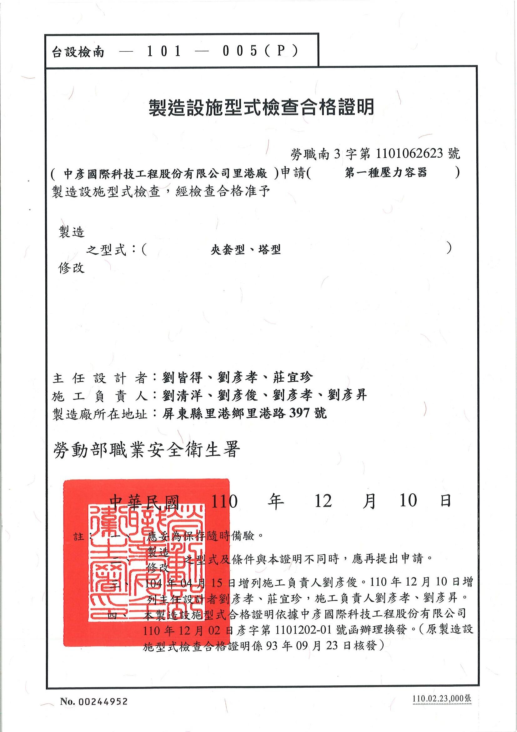 台設檢南-101-005(P) : 熔接第一種壓力容器(夾套型、塔型)