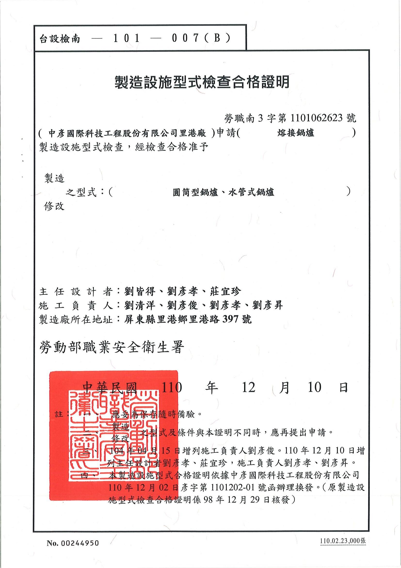 台設檢南-101-007(B) : 熔接鍋爐(圓筒型、水管式)
