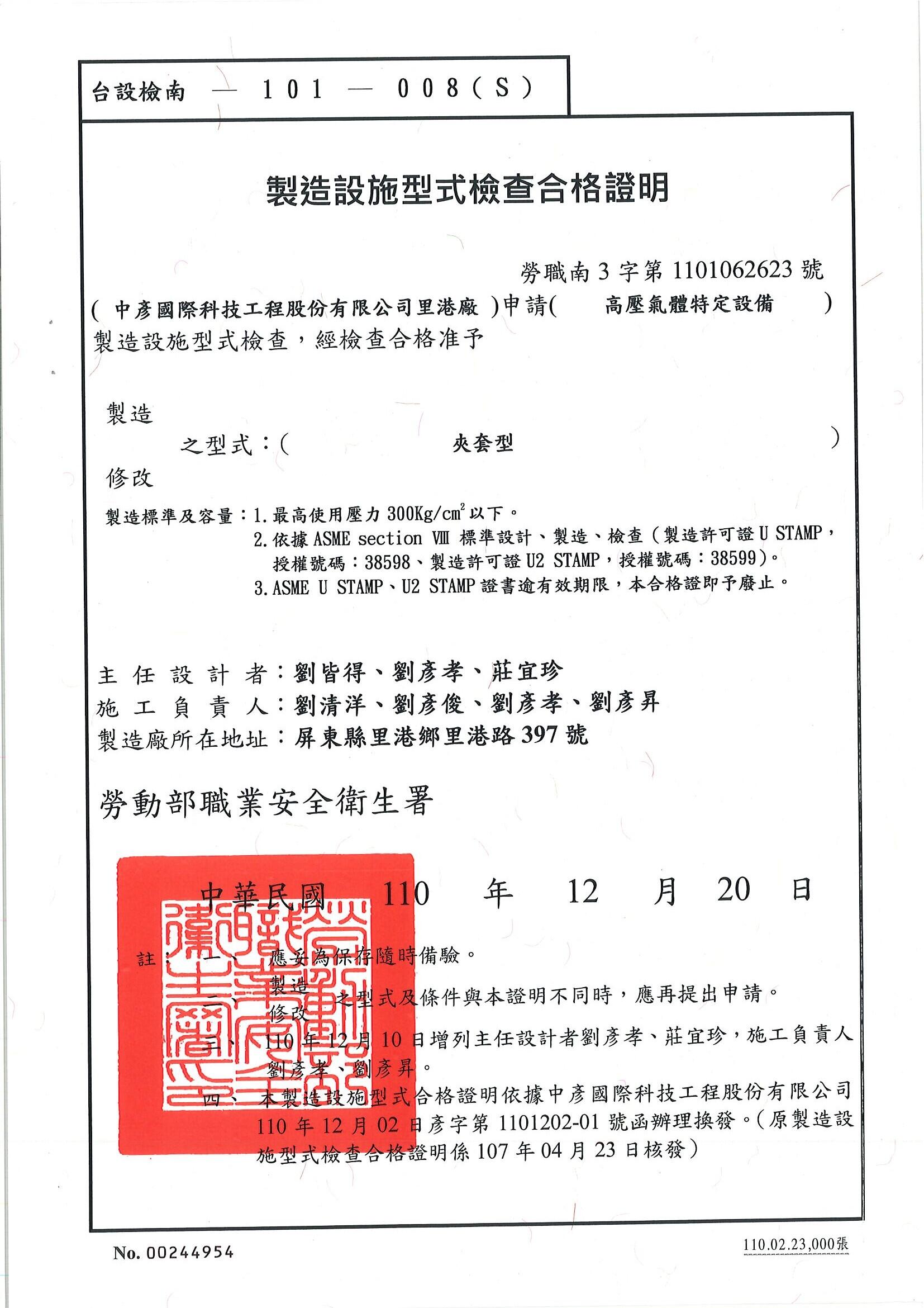 台設檢南-101-008(S) : 熔接高壓氣體特定設備(夾套型)
